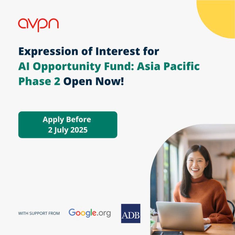 AVPN, với sự hỗ trợ từ Google.org và Ngân hàng Phát triển Châu Á (ADB), trân trọng thông báo khởi động Giai đoạn 2 của Quỹ Cơ Hội AI khu vực Châu Á – Thái Bình Dương, với trọng tâm là trao quyền cho người lao động trong bối cảnh chuyển đổi do trí tuệ…